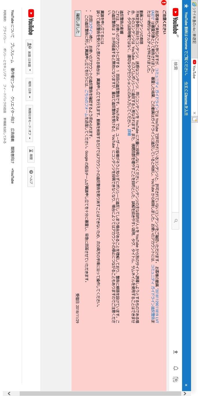 「YouTubeのコミュニティガイドラインに違反している」という理由で「20181129011819 LVT(A)(1)」というタイトルの動画が削除されました。 その後の私による異議申し立てにより削除措置は撤回されました。 この動画は以下のページで見れます。 戦場 > シナイ半島 > 名所 > 狙撃拠点c4a 見ての通り、違反どこがやねん、という風にYouTubeのコミュニティガイドラインに違反する恐れが全く無い動画です。 従がって審査員が間違って違反判定を出したとは考えられません。 当サイト「豪遊記」内のスパム告発記事を不都合とする物がYouTubeに不正な要求を行ない私のYouTubeアカウントをBANしようと狙ったに違い有りません。 |