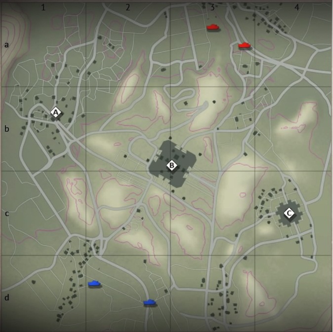 楼閣村。B, C に楼閣あり。A には遮弾物なし。楼閣以外の建築は全て木造の透弾民家。