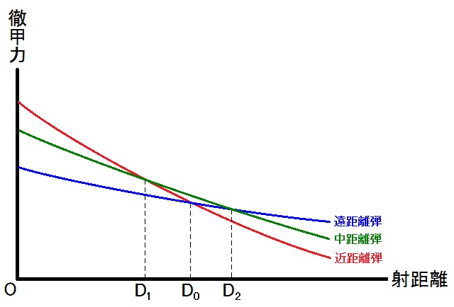 | 近距離弾は単純徹甲弾 | DM≧D1 | x<D2 | 中距離弾 | ||||