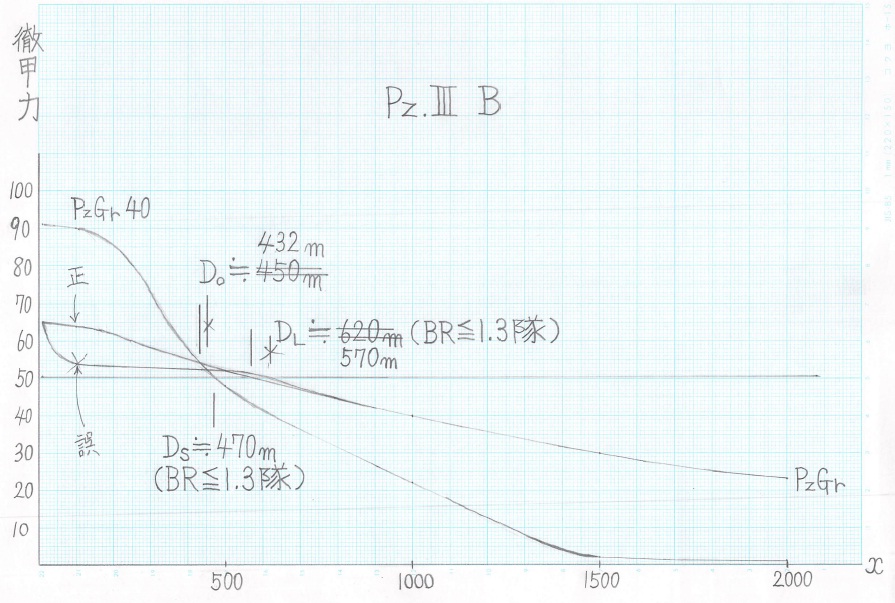 ![]() wikiのPz.III BのページにはPzGrの射距離100[m]での徹甲厚は54[mm]だと書かれていたが、これは誤りで正しくは64[mm]だと分かった(III号戦車E型のページを見て)のでグラフを描き直した。 |